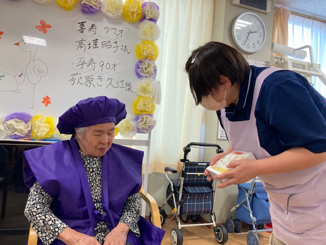 今年の長寿のお祝い対象者は白寿(99歳)1名、卒寿(90歳)1名、傘寿(80歳)1名、喜寿(77歳)4名、計7名の方がいらっしゃいました。