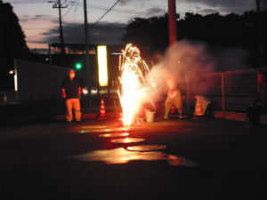 手持ち花火が一段落したところで次はメインの噴出花火と打ち上げ花火です。